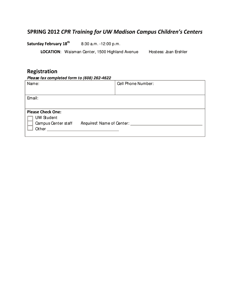 SPRING 2012 CPR Training for UW Madison Campus Children's Centers Saturday, February 18th 8:30 a.m. 12:00 p.m. LOCATION: Waksman Center, 1500 Highland Avenue Hostess: Joan Either Registration Please
