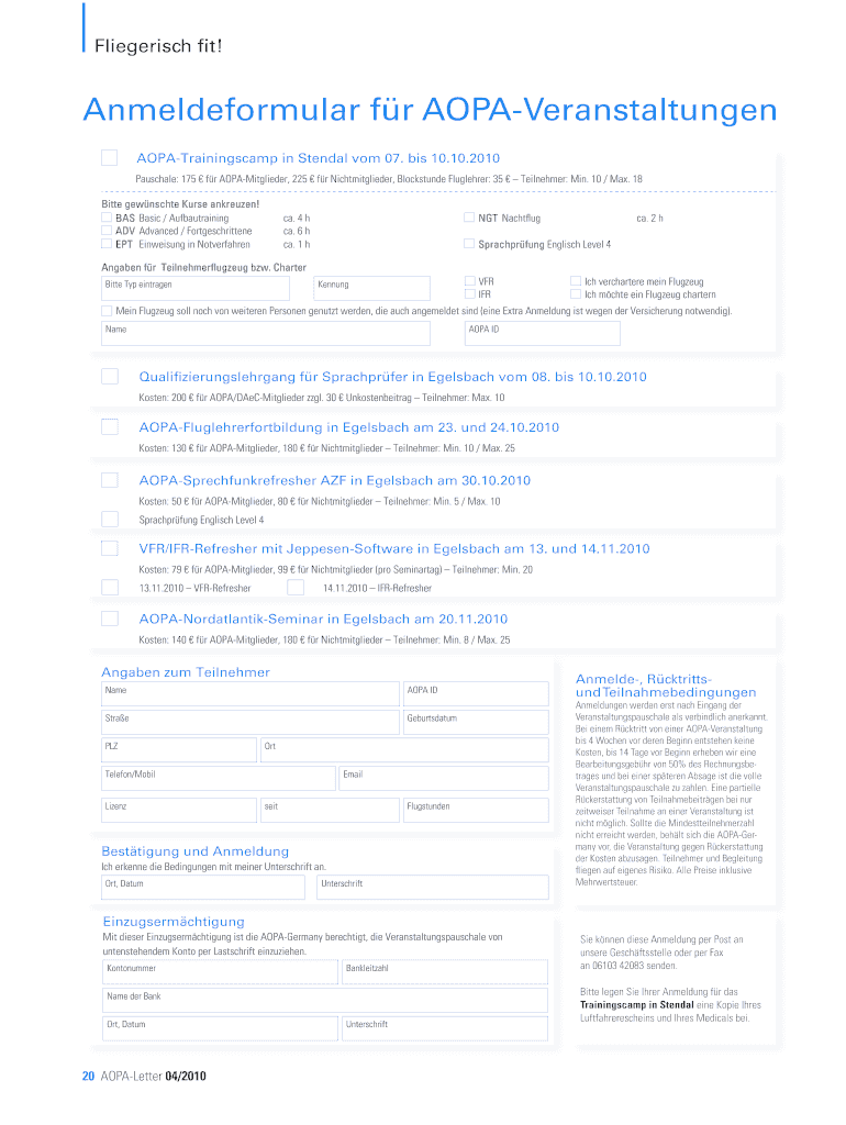Fliegerisch t! Anmeldeformular for AOPAVeranstaltungen AOPATrainingscamp in Stendhal com 07. Bis 10.10.2010 Paschal: 175 fr AOPAMitglieder, 225 fr Nichtmitglieder, Blackstone Fuehrer: 35 Teilnehmer: