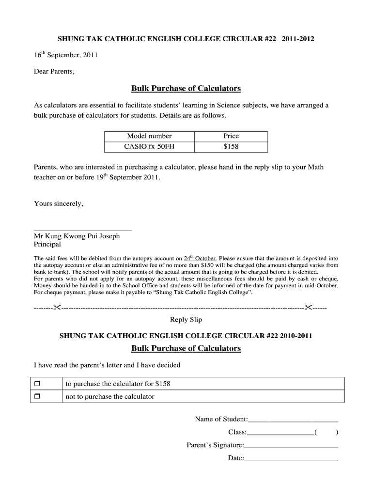 SUNG TAKE CATHOLIC ENGLISH COLLEGE CIRCULAR #22 20112012 16th September 2011 Dear Parents, Bulk Purchase of Calculators As calculators are essential to facilitate students learning in Science subjects,