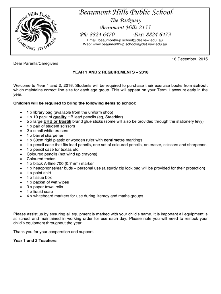 Beaumont Hills Public School The Parkway Beaumont Hills 2155 pH: 8824 6470 Fax: 8824 6473 Email: Beaumont. School DET.NSW.edu.AU Web: www.beaumonthip.schools DET.NSW.edu.AU 16 December 2015 Dear Parents×Caregivers