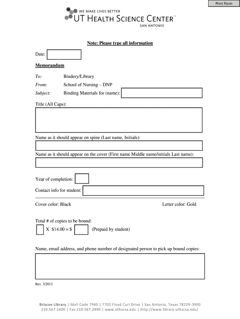 Print Form Note: Please type all information Date: Memorandum To: Bindery×Library From: School of Nursing DNP Subject: Binding Materials for (name): Title (All Caps): Name as it should appear on