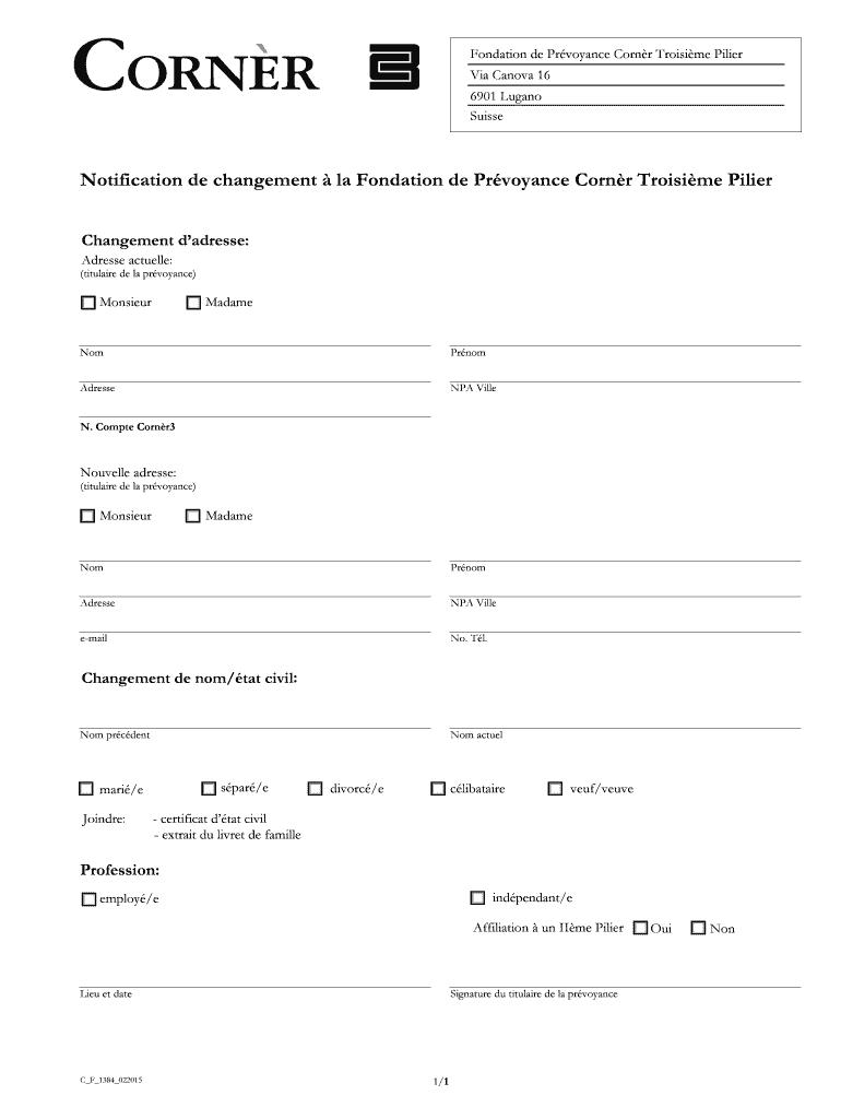 Notification DE management la Foundation de Prvoyance Corner Rosie Pillar. Management address: Address actually: