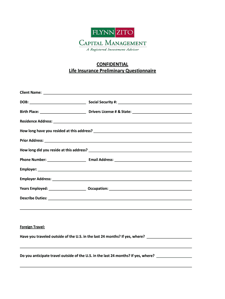 CONFIDENTIAL Life Insurance Preliminary QuestionnaireClient Name: DOB:Social Security #:birthplace:Driver's License # & State:Residence Address: How long have you resided at this address? Prior Address: