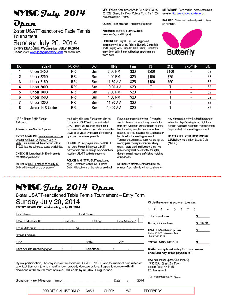 Disc July 2014 Open VENUE: New York Indoor Sports Club (NY ISC×, 1535 126th Street, 2nd Floor, College Point, NY 11356, 7183588860 (You Shaw) 2star USATTsanctioned Table Tennis Tournament REFEREE: