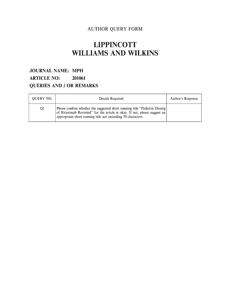 AUTHOR QUERY FORM LIPPINCOTT WILLIAMS AND WILKINS JOURNAL NAME: MPH ARTICLE NO: 201061 QUERIES AND / OR REMARKS QUERY NO. Details Required Q1 Please corm whether the suggested short running title
