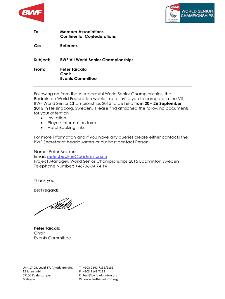 To:Member Associations Continental Confederations:RefereesSubject:BWF VII World Senior ChampionshipsFrom:Peter Tarawa Chair Events CommitteeFollowing on from the VI successful World Senior Championships,