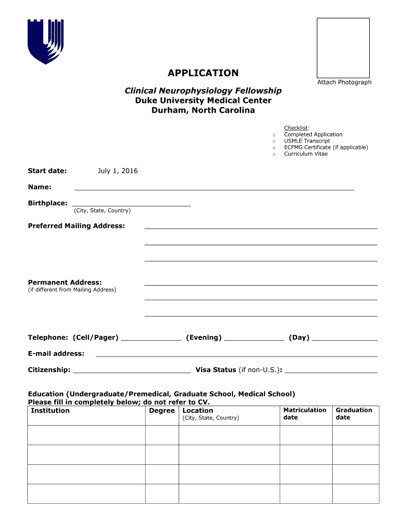 APPLICATION Attach Photograph Clinical Neurophysiologist Fellowship Duke University Medical Center Durham, North Carolina o o o o Start date: Checklist: Completed Application USMLE Transcript EC FMG
