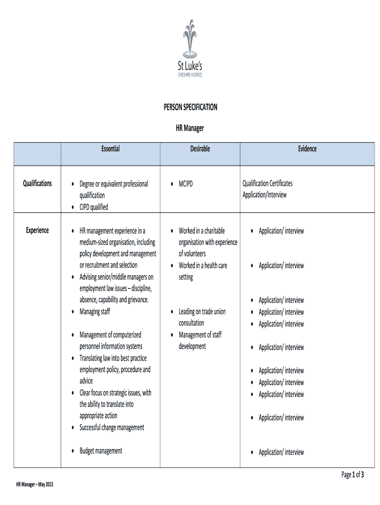 PERSON SPECIFICATION HR Manager EssentialQualificationsDegree or equivalent professional qualification CIPD qualifiedMCIPDHR management experience in a medium-sized organization, including policy