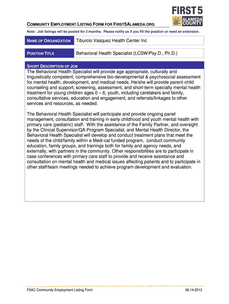 COMMUNITY EMPLOYMENT LISTING FORM FOR FIRST5ALAMEDA.ORG Note: Job listings will be posted for 2 months. Please notify us if you fill the position or need an extension. NAME OF ORGANIZATION Timurid