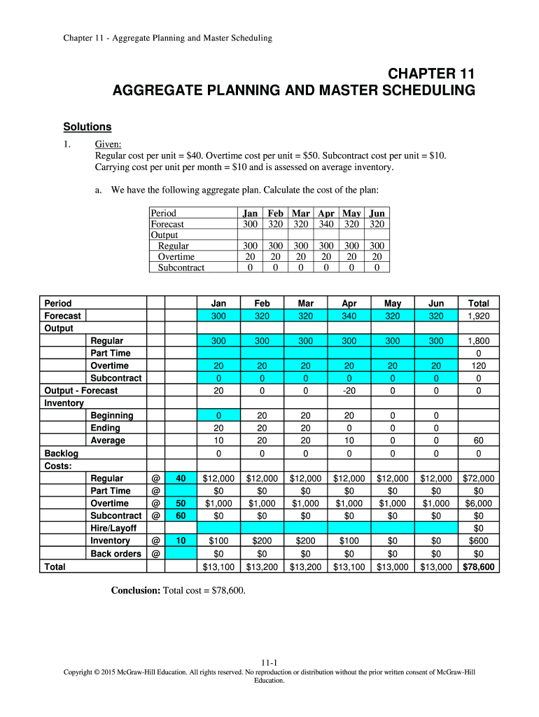 Chapter 11 Aggregate Planning and Master SchedulingCHAPTER 11 AGGREGATE PLANNING AND MASTER SCHEDULING Solutions 1. Given: Regular cost per unit $40. Overtime cost per unit $50. Subcontract cost per