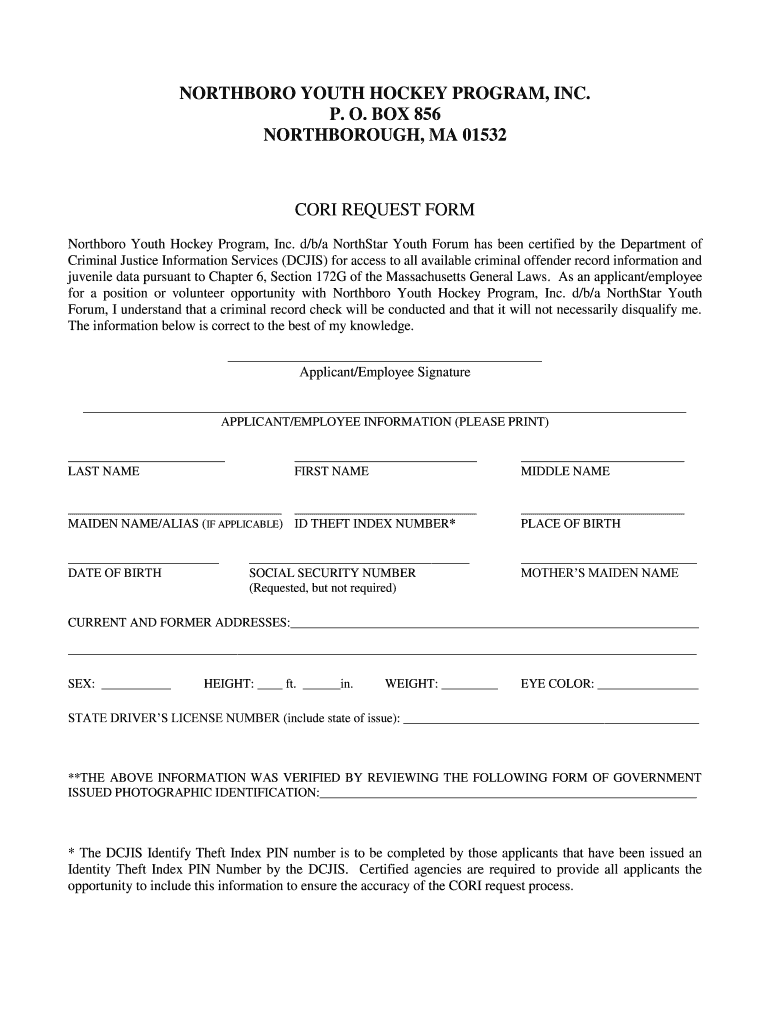NORTHPORT YOUTH HOCKEY PROGRAM, INC. P. O. BOX 856 NORTHBOROUGH, MA 01532 CORI REQUEST FORM Northbrook Youth Hockey Program, Inc. d×b/a Northward Youth Forum has been certified by the Department