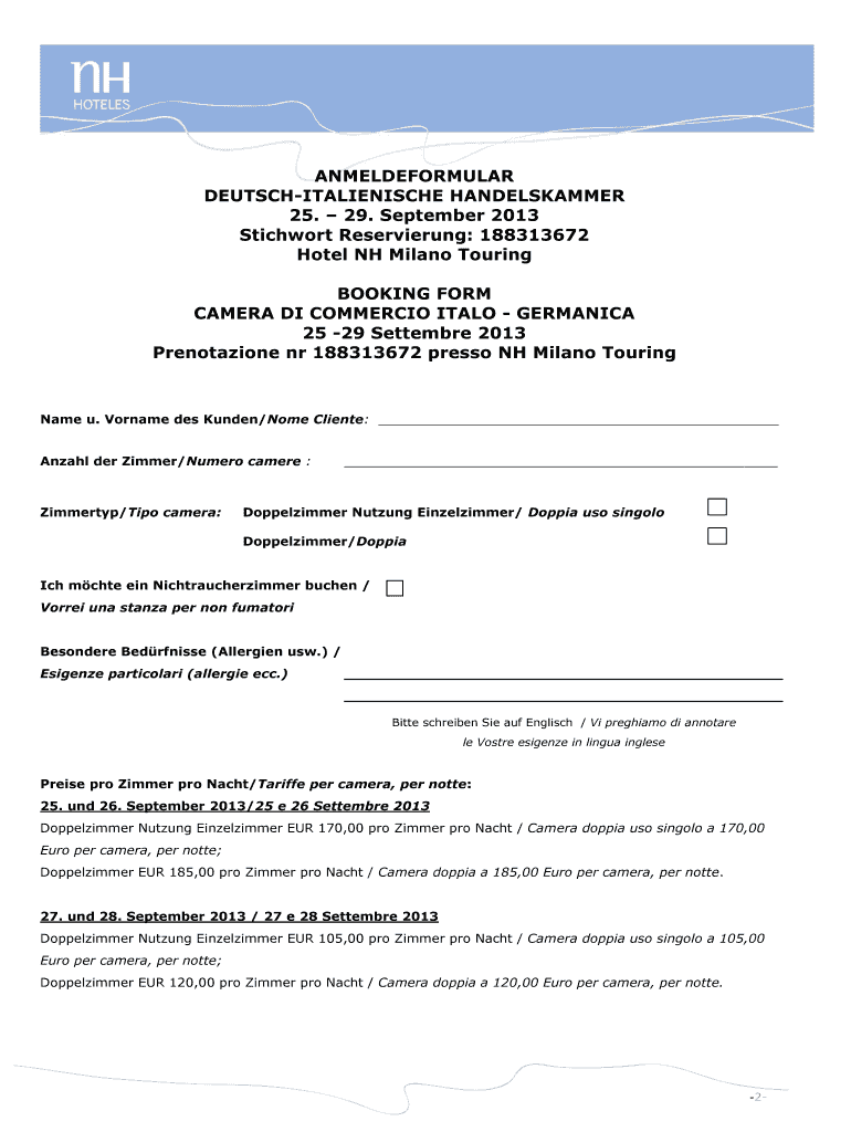 ANMELDEFORMULAR DEUTSCHITALIENISCHE HANDELSKAMMER 25. 29. September 2013 Stockport Reserving: 188313672 Hotel NH Milano Touring BOOKING FORM CAMERA DI COMMERCIAL ITALY GERMANIC 25 29 September 2013