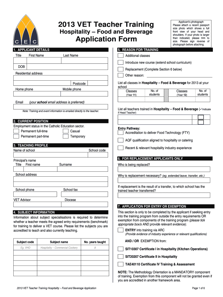 Obtain the 2013 VET Teacher Training Hospitality – Food and Beverage Application Form from the official website or relevant educational institution.
