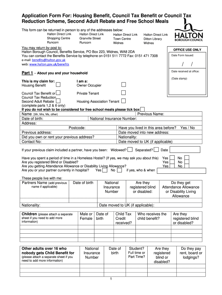 Application Form For: Housing Benefit, Council Tax Benefit or Council Tax Reduction Scheme, Second Adult Rebate and Free School Meals This form can be returned in person to any of the addresses below: