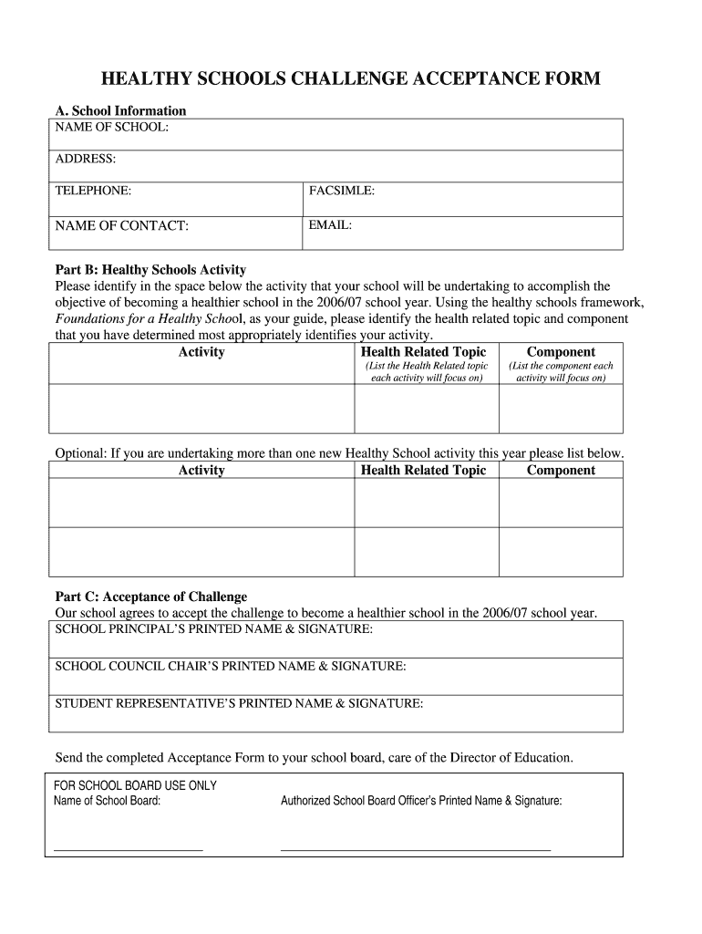 Obtain the HEALTHY SCHOOLS CHALLENGE ACCEPTANCE FORM from the official website or designated school office.