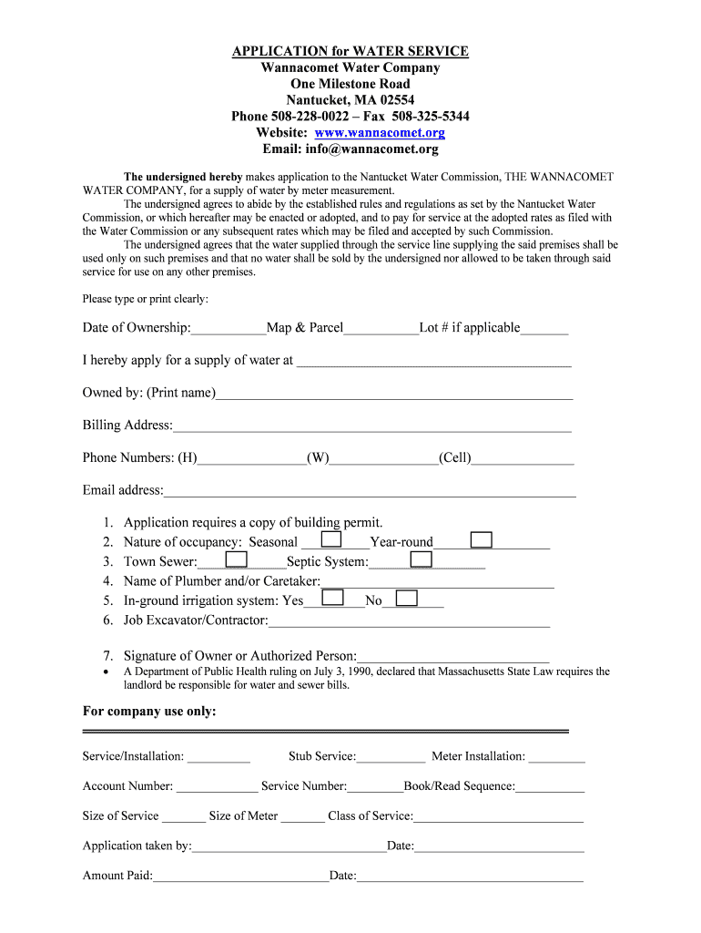 APPLICATION for WATER SERVICE Wanna comet Water Company One Milestone Road Nantucket, MA 02554 Phone 5082280022 Fax 5083255344 Website: www.wannacomet.org Email: info wanna comet.org The undersigned