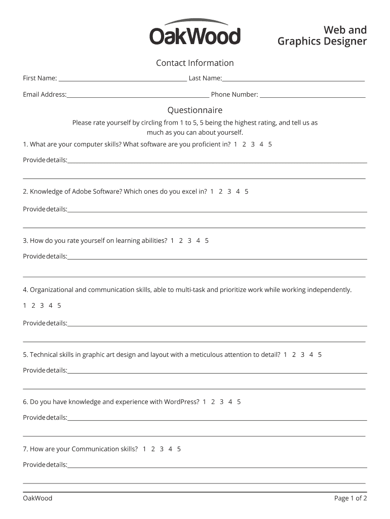 Web and Graphics Designer Contact Information First Name: Last Name: Email Address: Phone Number: Questionnaire Please rate yourself by circling from 1 to 5, 5 being the highest rating, and tell us