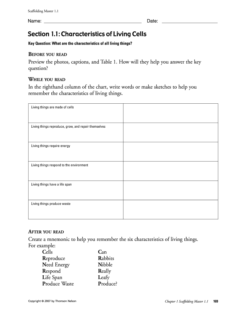 Scaffolding Master 1.1 Name: Date: Section 1.1: Characteristics of Living Cells Key Question: What are the characteristics of all living things? BEFORE YOU READ Preview the photos, captions, and Table