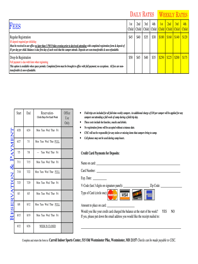 DAILY RATES FEES WEEKLY RATES 1st 2nd 3rd 4th 1st 2nd 3rd 4th Child Regular Registration $45 ×40 ×35 ×30 ×180 ×160 ×140 ×120 ×50 ×45 ×40 ×35 ×250 ×225 ×200 ×175 ×5 deposits required