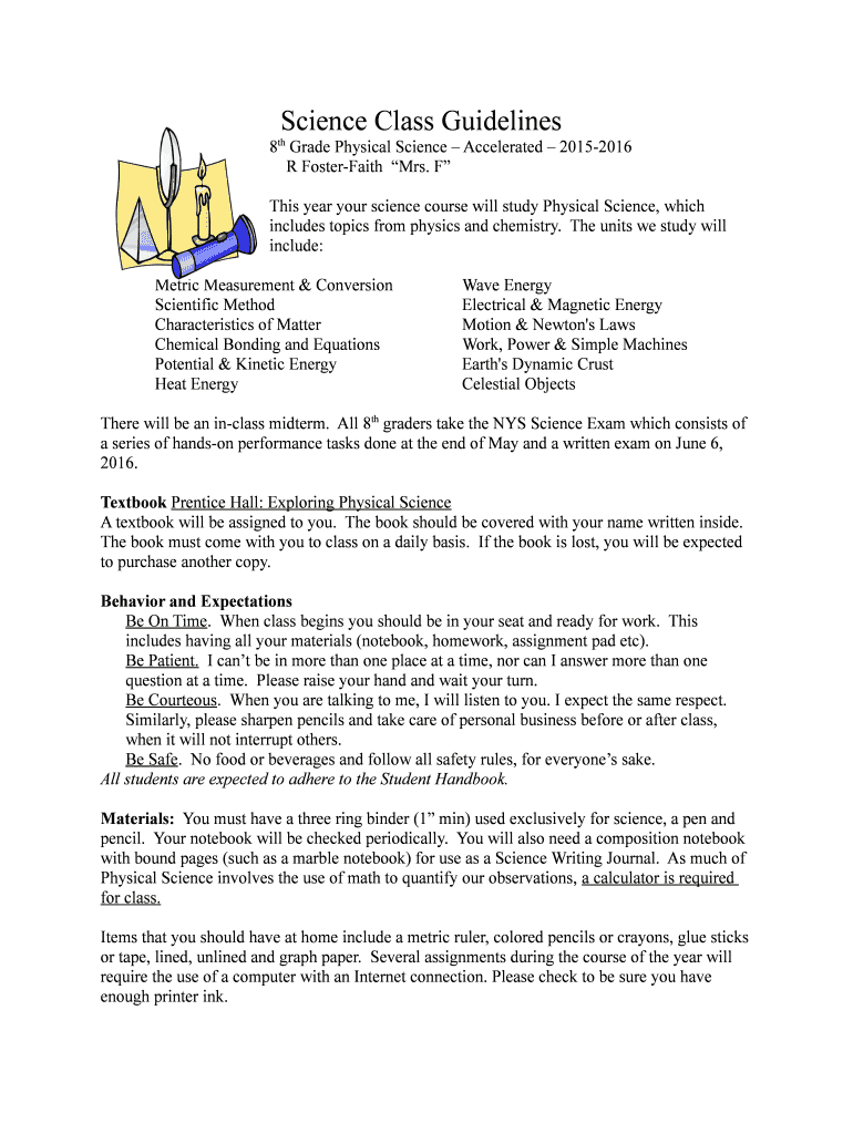 Science Class Guidelines TH 8 Grade Physical Science Accelerated 20152016 R Foster Faith Mrs. F This year your science course will study Physical Science, which includes topics from physics and chemistry.