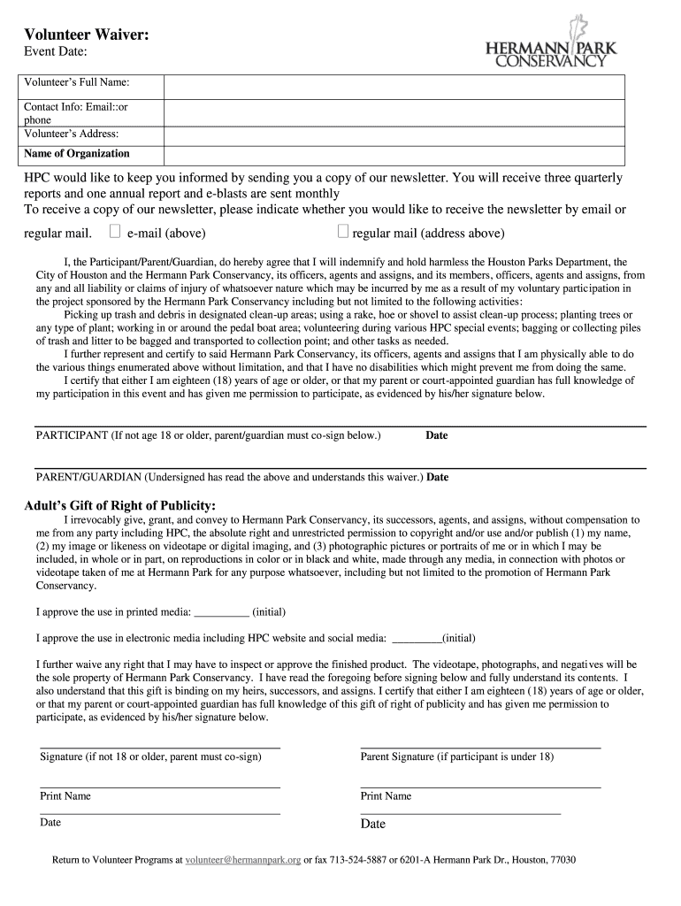Email, fax, or share your hermann park conservancy waiver form via URL. You can also download, print, or export forms to your preferred cloud storage service.