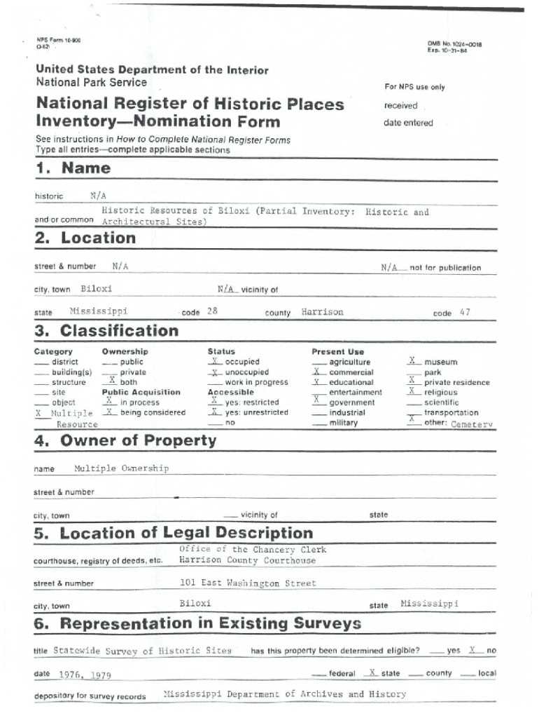 This document serves as an inventory and nomination form for historic resources in Biloxi, Mississippi, highlighting significant architectural sites and their historical context.