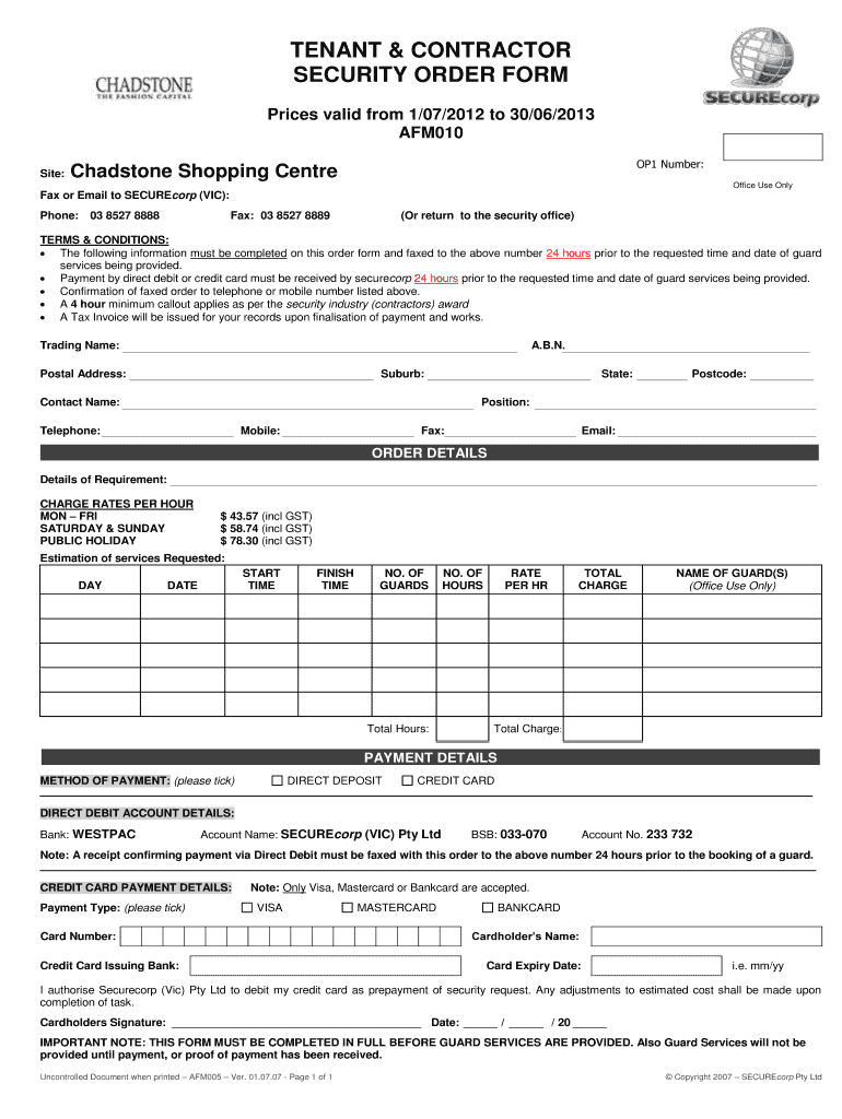 TENANT & CONTRACTOR SECURITY ORDER FORM Prices valid from 1×07/2012 to 30×06/2013 AFM010 Site: OP1 Number: Chad stone Shopping Center Office Use Only Fax or Email to SECURE corp (VIC): Phone: 03