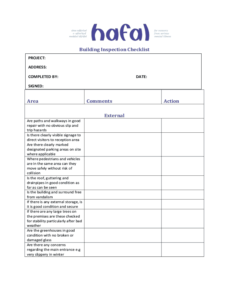 Building Inspection Checklist PROJECT: ADDRESS: COMPLETED BY: DATE: SIGNED: Area Comments External Are paths and walkways in good repair with no obvious slip and trip hazards Is there clearly visible