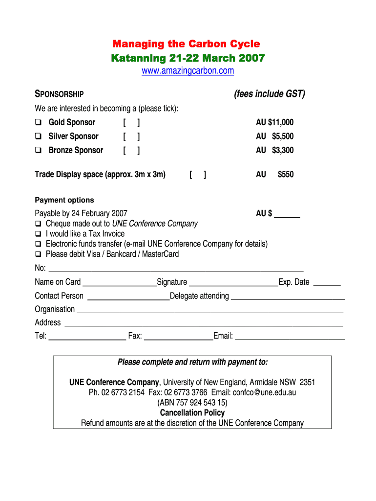WWW.amazingcarbon.com (fees include GST) SPONSORSHIP We are interested in becoming a (please tick): J Gold Sponsor AU $11,000 J Silver Sponsor AU $5,500 J Bronze Sponsor AU $3,300 Trade Display space