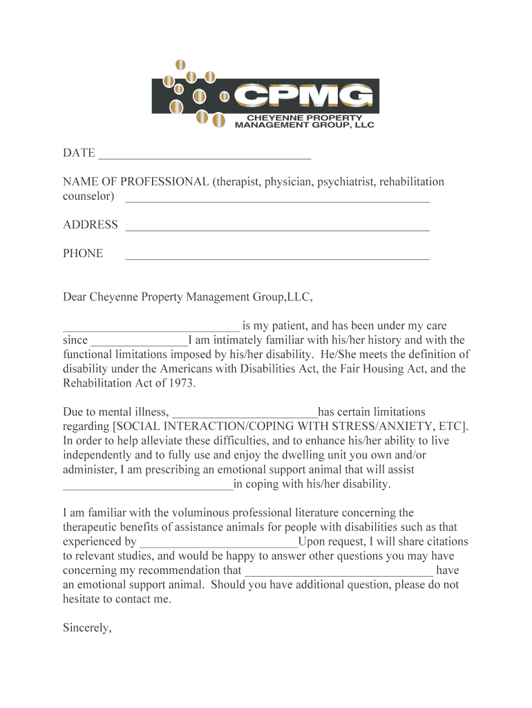 DATE NAME OF PROFESSIONAL (therapist, physician, psychiatrist, rehabilitation counselor) ADDRESS PHONE Dear Cheyenne Property Management Group, LLC, is my patient, and has been under my care since