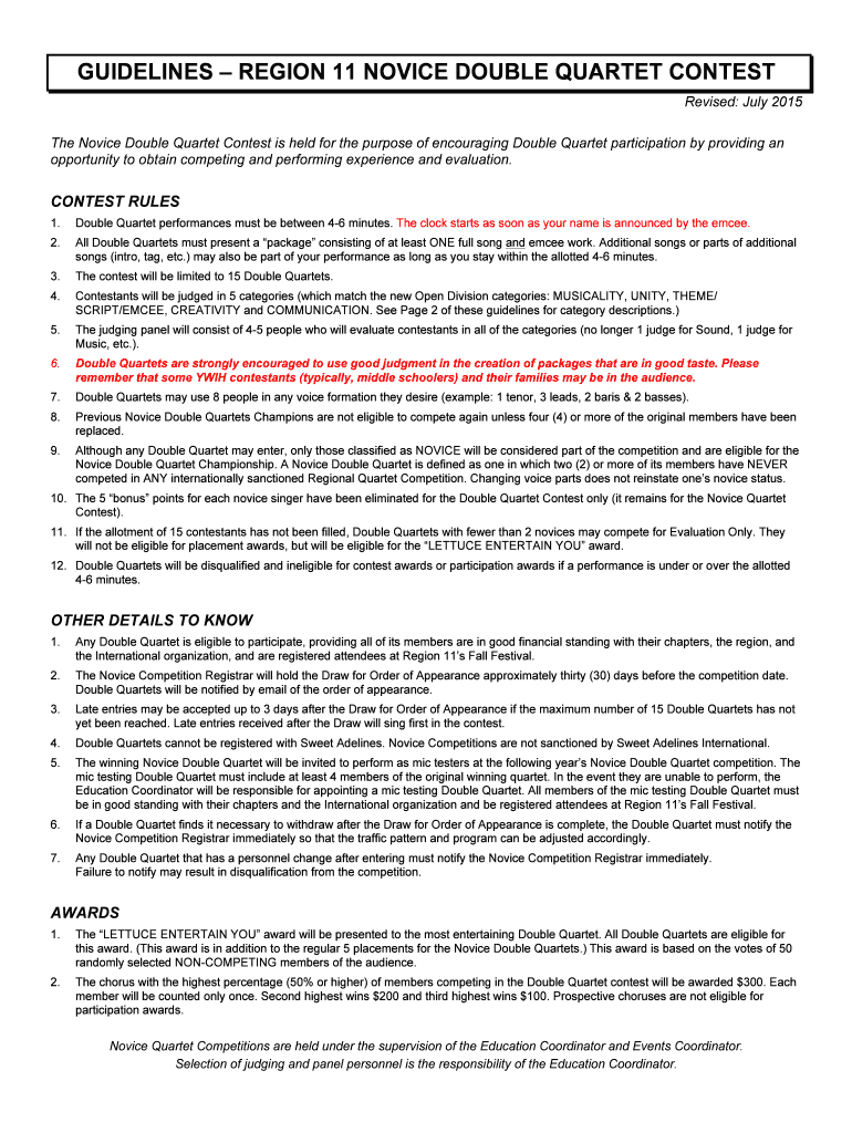 GUIDELINES REGION 11 NOVICE DOUBLE QUARTET CONTEST Revised: July 2015 The Novice Double Quartet Contest is held for the purpose of encouraging Double Quartet participation by providing an opportunity