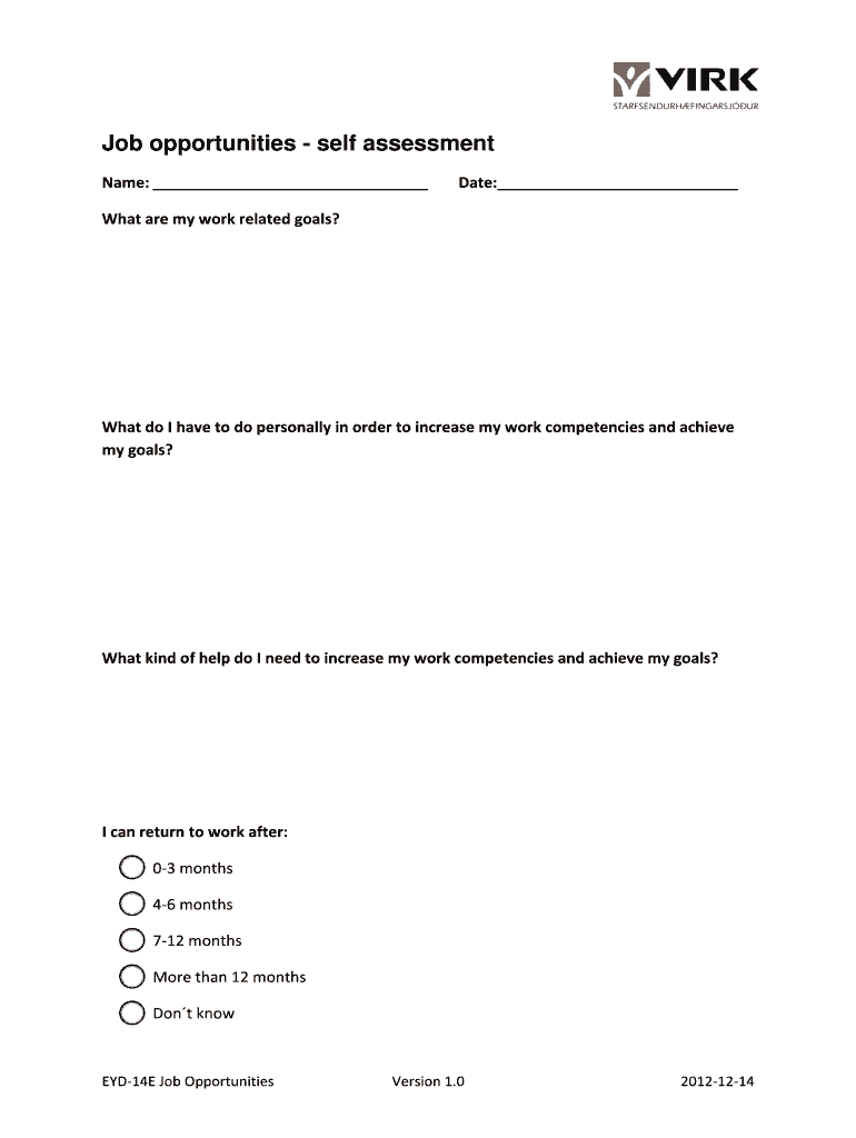 Job opportunities self assessment Name: Date: Whataremyworkrelatedgoals? WhatdoIhavetodopersonallyinordertoincreasemyworkcompetenciesandachieve my goals? WhatkindofhelpdoIneedtoincreasemyworkcompetenciesandachievemygoals?