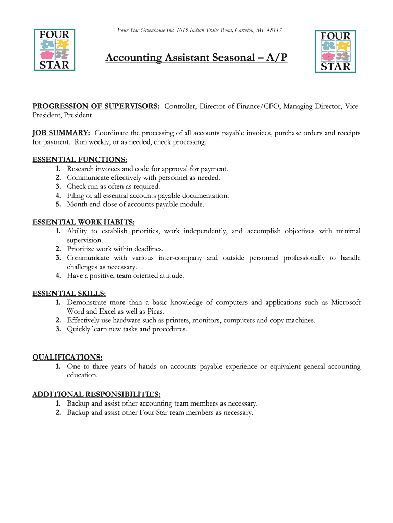 Four Star Greenhouse Inc. 1015 Indian Trails Road, Carleton, MI 48117 Accounting Assistant Seasonal A×P PROGRESSION OF SUPERVISORS: Controller, Director of Finance×CFO, Managing Director, VicePresident,