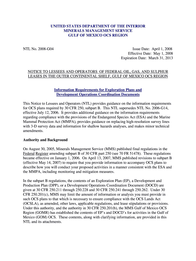This document provides guidance on the information requirements for Exploration Plans and Development Operations Coordination Documents under 30 CFR 250, specifically addressing compliance with the