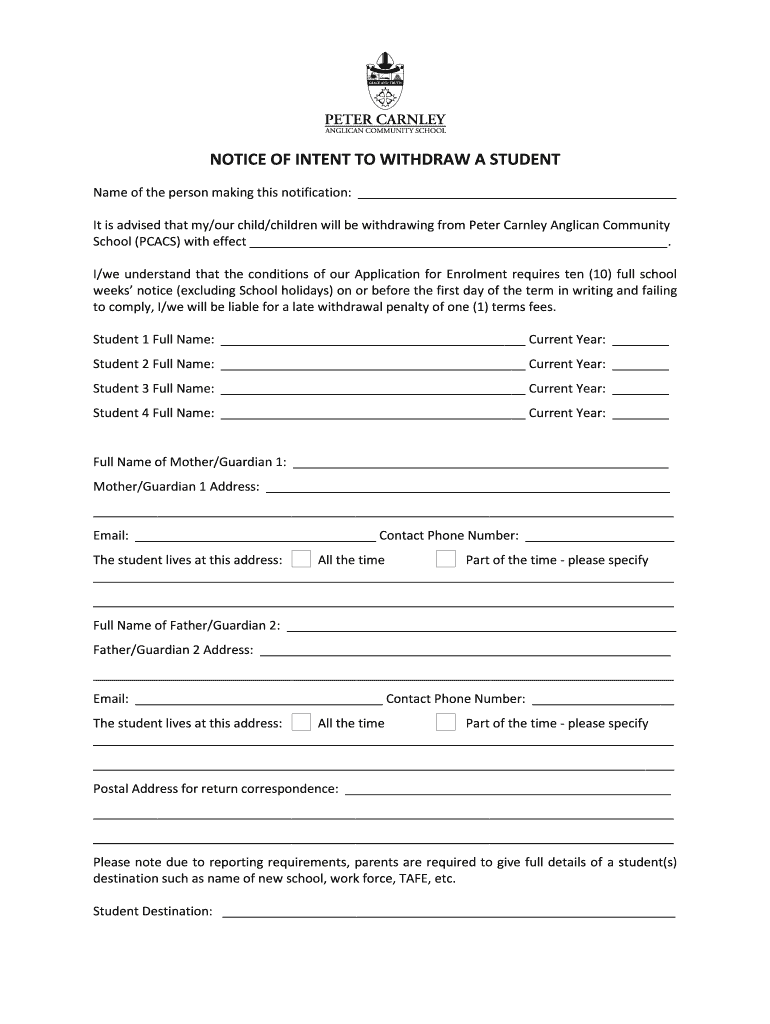 NOTICE OF INTENT TO WITHDRAW A STUDENT Name of the person making this notification: It is advised that my×our child×children will be withdrawing from Peter Carney Anglican Community School (PACS)