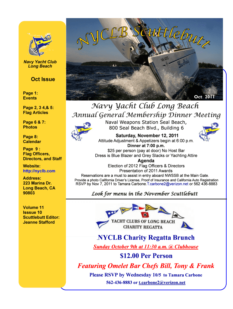 Navy Yacht Club Long Beach Oct Issue Page 1: Events Page 2, 3 4,& 5: Flag Articles Page 6 & 7: Photos Page 8: Calendar Page 9 : Flag Officers, Directors, and Staff Website: HTTP://nyclb.com Address: