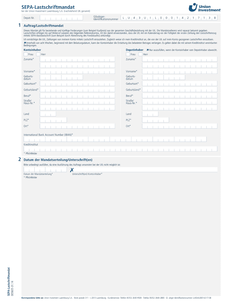 SEPALastschriftmandat BEI her Union Investment Luxembourg S.A. (nachstehend UIL pennant) Gluier U 4 3 U I L 0 0 0 1 4 2 1 7 1 3 8 Identifikationsnummer Depot. 1 Austral×Lastschriftmandat Daises Mandate