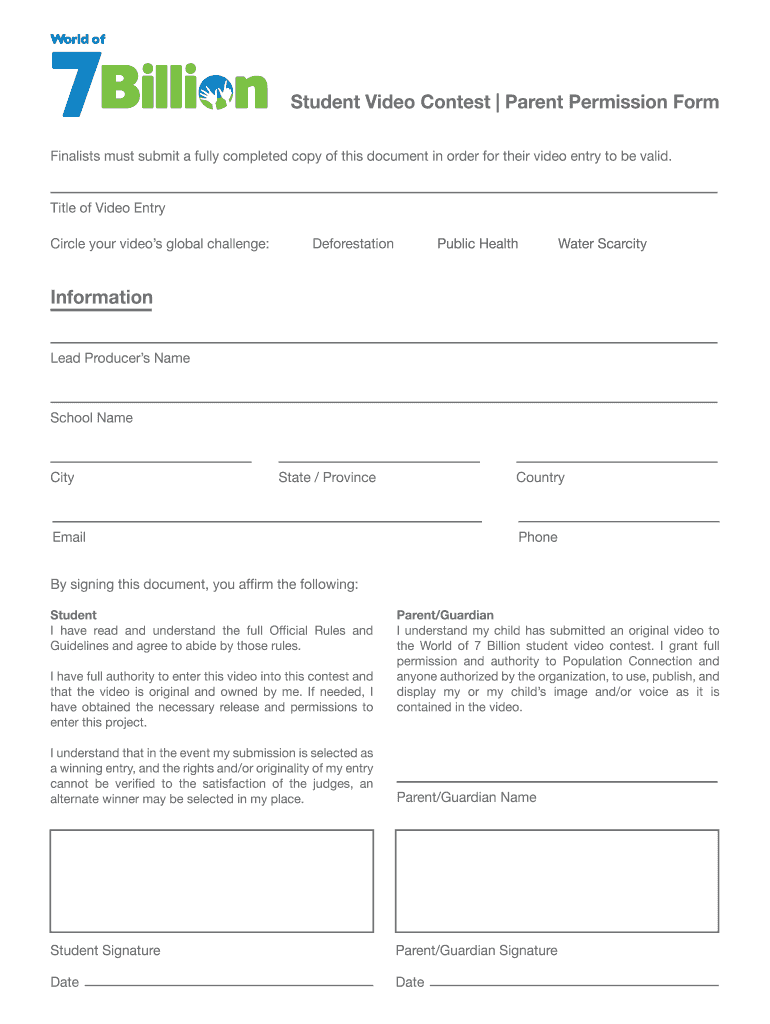 Contest organizers: The organizers of the student video contest may require a parent form to ensure they have all necessary contact information, parental consent, and authorization for certain activities involving the student.