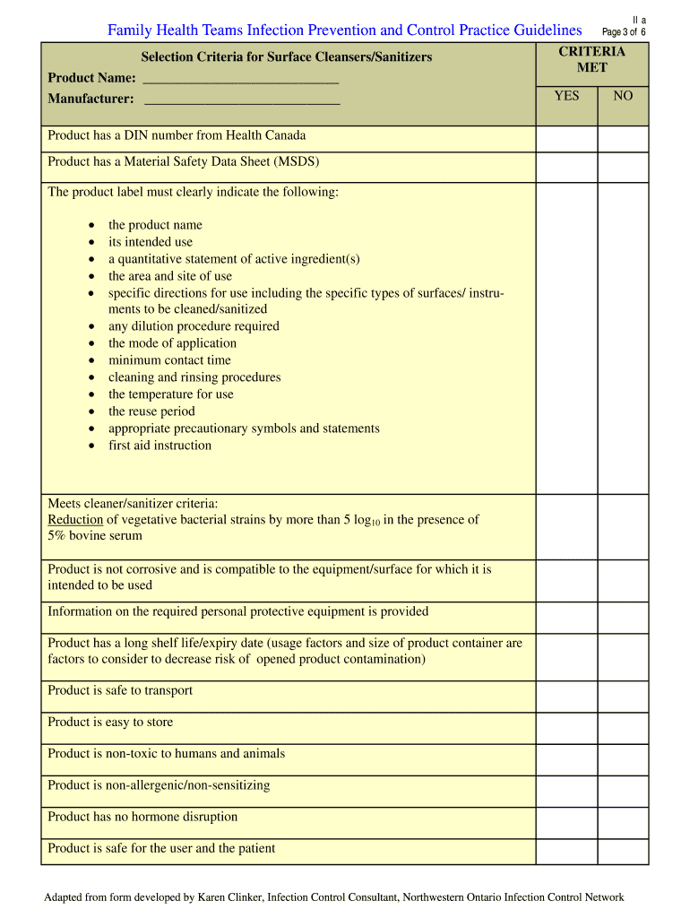 6.Use the YES/NO checkboxes to evaluate each criterion applicable to your selected surface cleansers and low-level disinfection products.