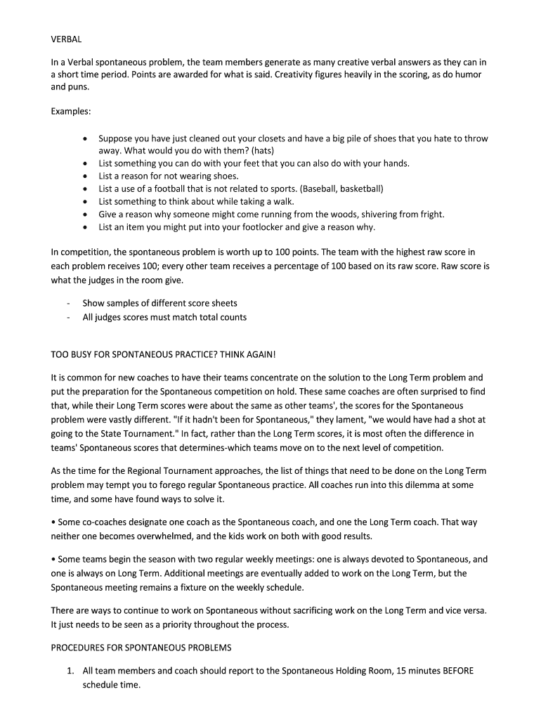 VERBAL In a Verbal spontaneous problem, the team members generate as many creative verbal answers as they can in a short time period. Points are awarded for what is said. Creativity figures heavily