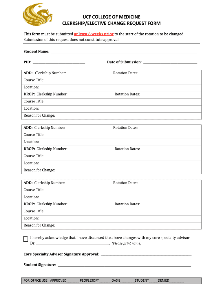 UCF COLLEGE OF MEDICINE CLERKSHIP×ELECTIVE CHANGE REQUEST From This form must be submitted at least 6 weeks prior to the start of the rotation to be changed. Submission of this request does not constitute