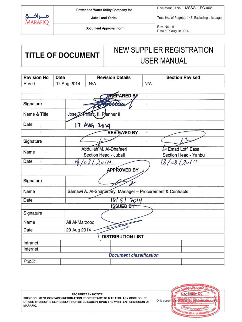 Document ID No : MSSG1PC002 Power and Water Utility Company for Total No. of Page’s) : 48 Excluding this page Jubal and Yang Rev. No.: 0 Date : 07 August 2014 Document Approval Form TITLE OF DOCUMENT