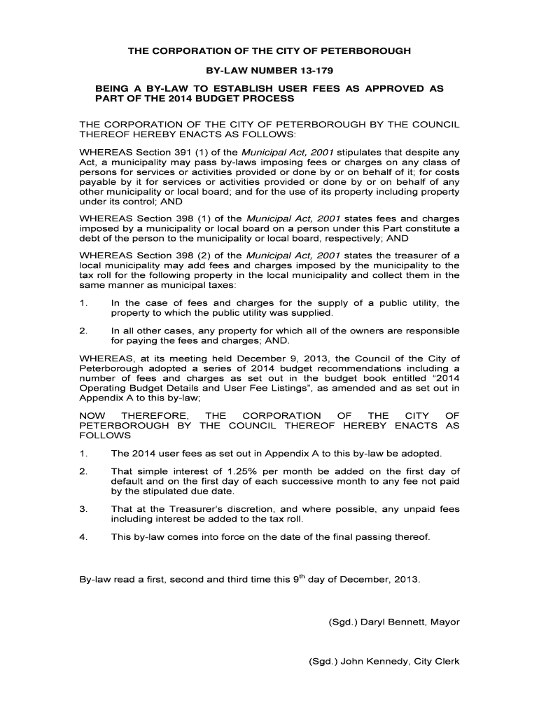 This by-law establishes user fees for various services and activities as recommended in the 2014 budget of The Corporation of the City of Peterborough.