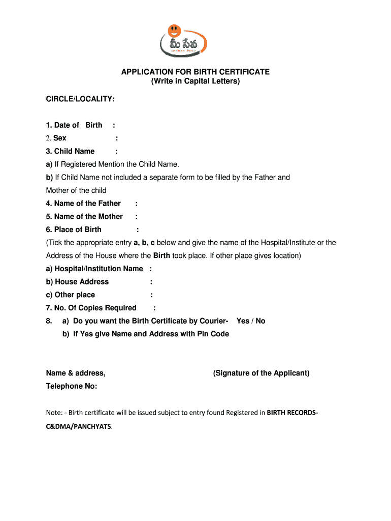 APPLICATION FOR BIRTH CERTIFICATE (Write in Capital Letters) CIRCLE×LOCALITY: 1. Date of Birth : 2. Sex : 3. Child Name : a) If Registered Mention the Child Name. B) If Child Name not included a