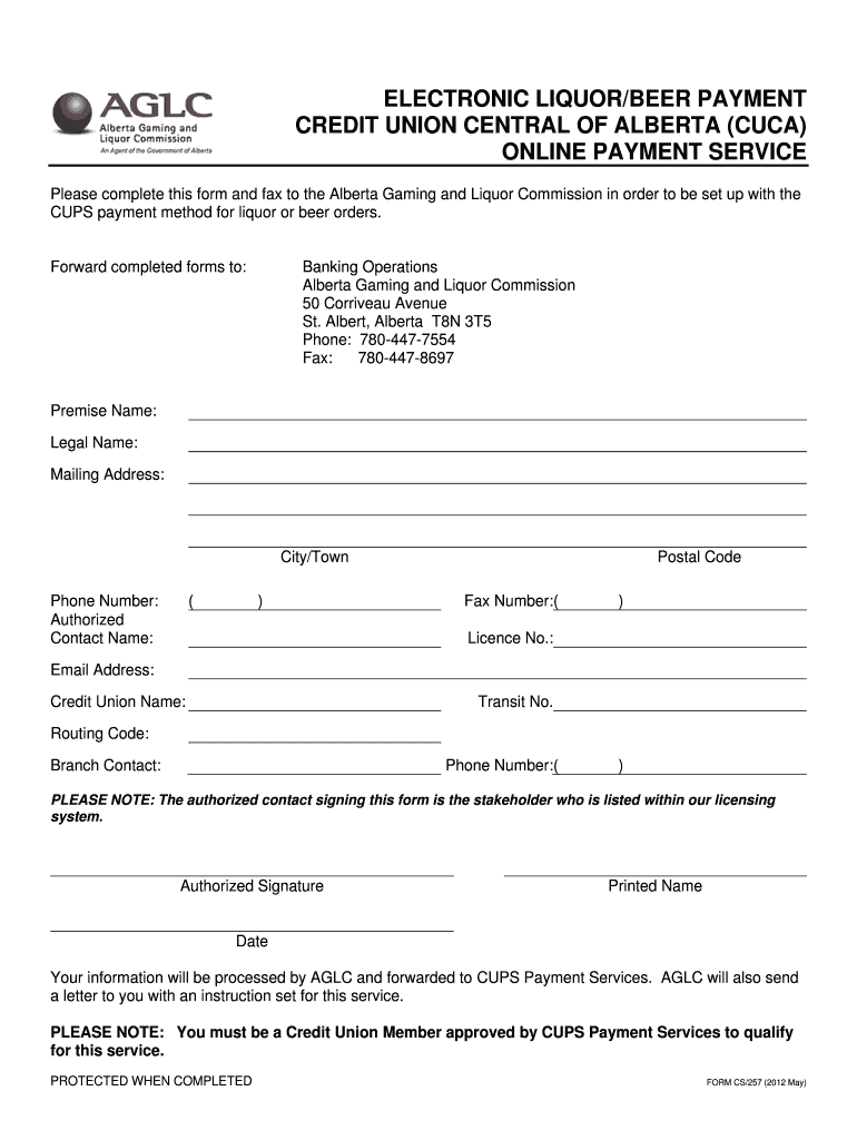 ELECTRONIC LIQUOR×BEER PAYMENT CREDIT UNION CENTRAL OF ALBERTA (CUBA) ONLINE PAYMENT SERVICE Please complete this form and fax to the Alberta Gaming and Liquor Commission in order to be set up with