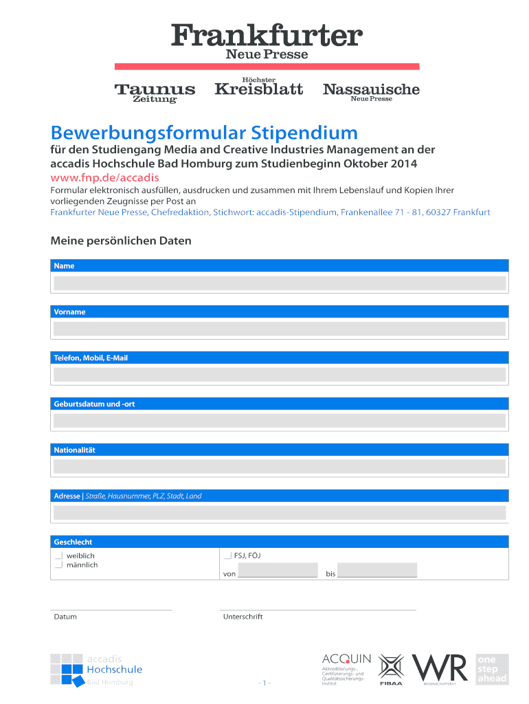 Bewerbungsformular Stipendium for den Studiengang Media and Creative Industries Management an arcades Hochschule Bad Homburg sum Studienbeginn October 2014 www.fnp.de×arcades Formula electronic Allen,