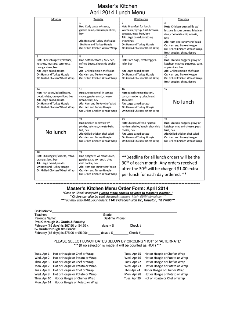 April 2014 Lunch Menu