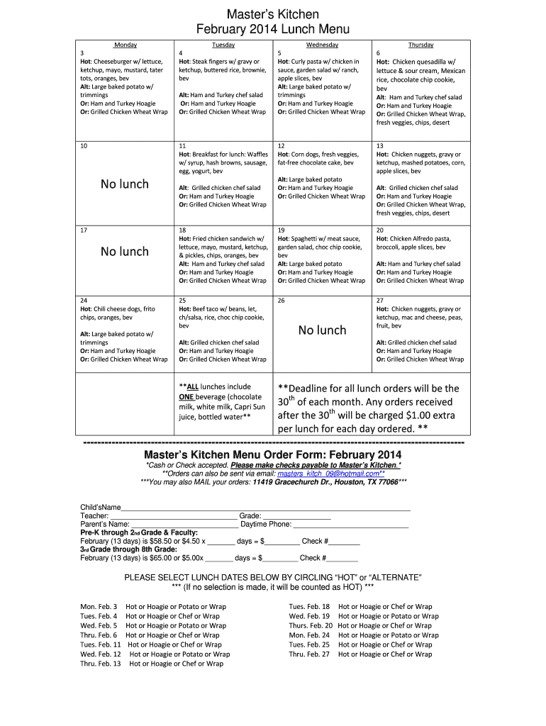 Masters Kitchen February 2014 Lunch Menu Monday 3 Hot: Cheeseburger w/ lettuce, ketchup, mayo, mustard, tater tots, oranges, BEV Alt: Large baked potato w/ trimmings Or: Ham and Turkey Hoagie Or: