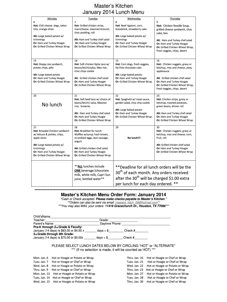 Masters Kitchen January 2014 Lunch Menu Monday 6 Hot: Chili cheese dogs, tatter tots, orange slices Alt: Large baked potato w/ trimmings Or: Ham and Turkey Hoagie Or: Grilled Chicken Wheat Wrap 13
