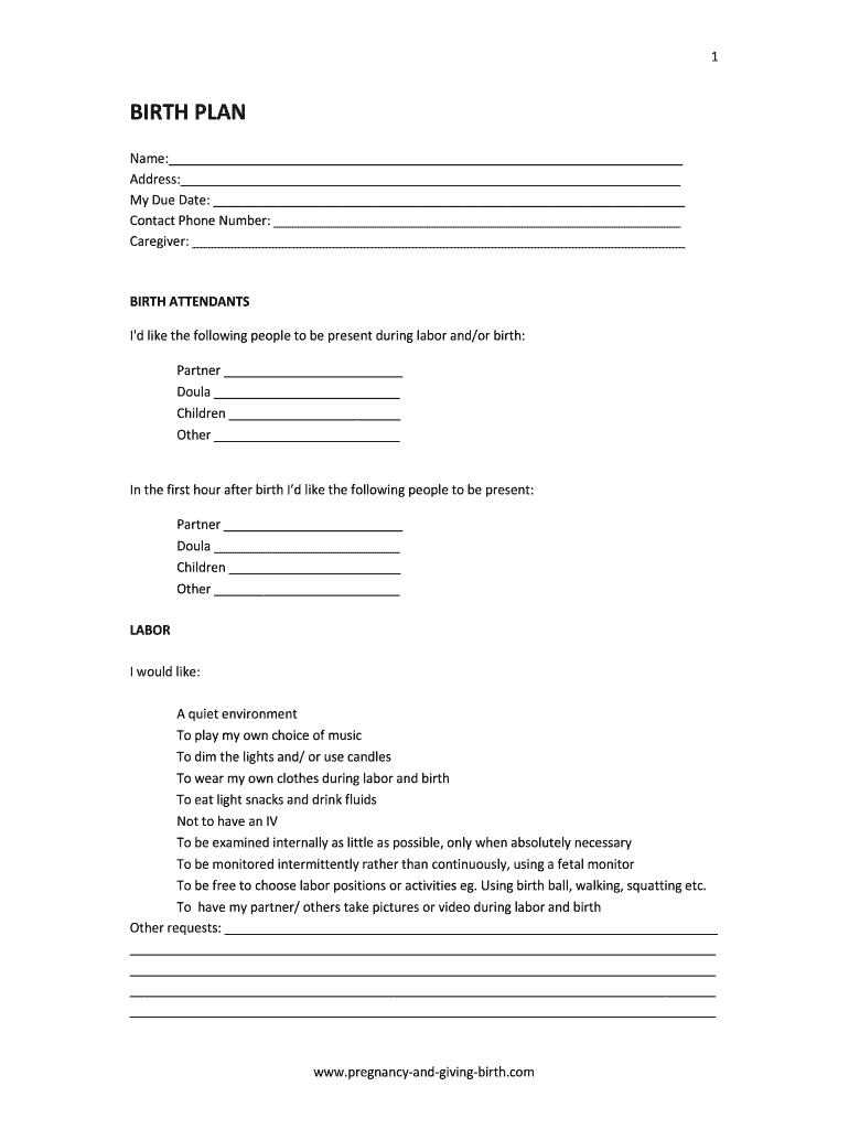 1 BIRTH PLAN Name: Address: My Due Date: Contact Phone Number: Caregiver: BIRTH ATTENDANTS I'd like the following people to be present during labor and×or birth: Partner Douala Children Other In